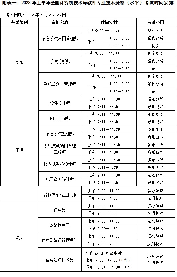 一、《2023年上半年全國計(jì)算機(jī)技術(shù)與軟件專業(yè)技術(shù)資格(水平)考試時(shí)間安排》