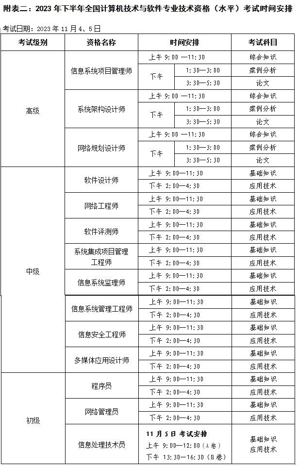 二、《2023年下半年全國計(jì)算機(jī)技術(shù)與軟件專業(yè)技術(shù)資格(水平)考試時(shí)間安排》