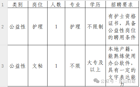 招聘2人:公益性崗位:招護(hù)理專業(yè)人員1名及文秘專業(yè)1名。詳見下表: