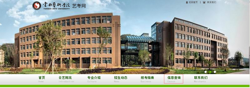 一、進(jìn)入云南藝術(shù)學(xué)院官網(wǎng)(http://www.ynart.edu.cn/index.shtml),點(diǎn)擊首頁(yè)上方導(dǎo)航條中“藝考網(wǎng)”鏈接,進(jìn)入藝考網(wǎng)首頁(yè)。