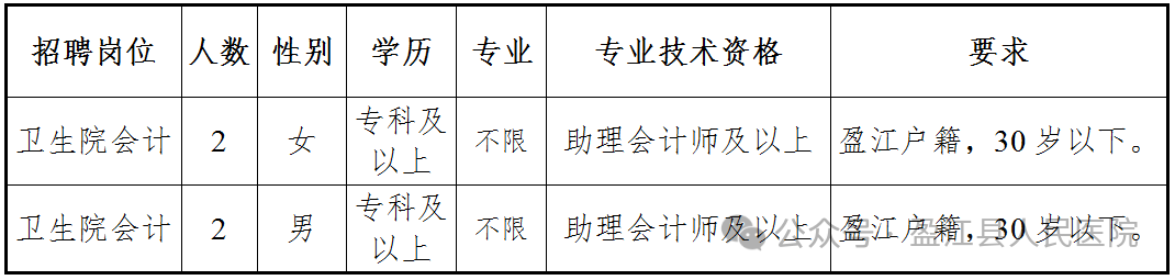 為加強衛(wèi)生院人才隊伍建設,提升衛(wèi)生院財務管理能力,促進衛(wèi)生院可持續(xù)發(fā)展,受卡場鎮(zhèn)中心衛(wèi)生院、勐弄鄉(xiāng)中心衛(wèi)生院、舊城鎮(zhèn)中心衛(wèi)生院、支那鄉(xiāng)衛(wèi)生院的委托,由盈江縣緊密型縣域醫(yī)共體總院盈江縣人民醫(yī)院牽頭面向社會公開為上述4家衛(wèi)生院招聘編外財務人員各 1名,現(xiàn)公告如下:
