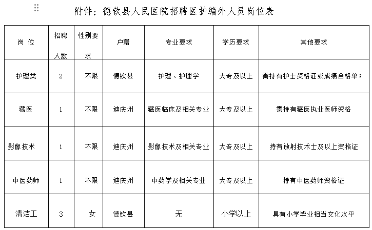 德欽縣人民醫(yī)院是德欽縣唯一一所二級(jí)甲等綜合醫(yī)院,根據(jù)醫(yī)院業(yè)務(wù)發(fā)展需求,決定面向社會(huì)公開(kāi)招聘編外護(hù)理、醫(yī)學(xué)影像技術(shù)、中醫(yī)藥、藏醫(yī)臨床及清潔工等工作人員(具體詳見(jiàn)附件),現(xiàn)將有關(guān)事項(xiàng)公告如下: