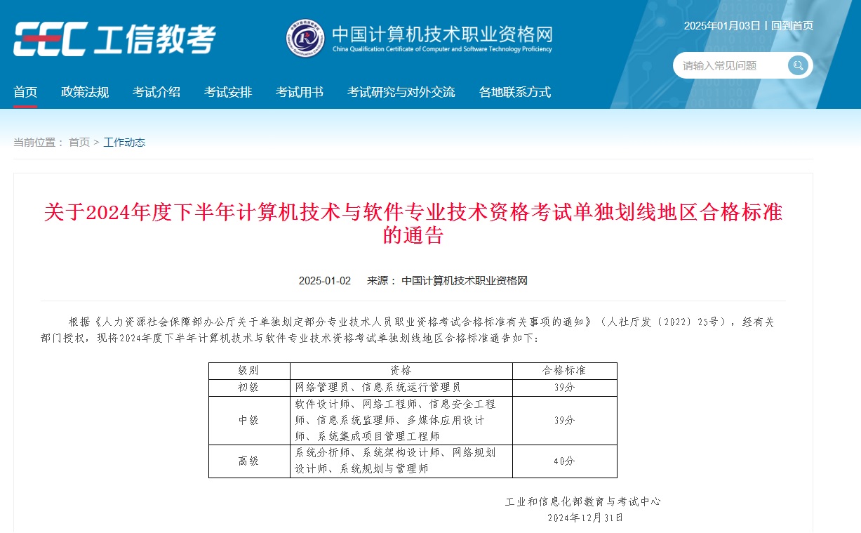 關(guān)于2024年度下半年計算機技術(shù)與軟件專業(yè)技術(shù)資格考試單獨劃線地區(qū)合格標準的通告