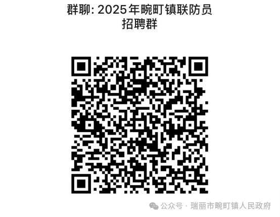 4.報名人員需掃描招聘公告上的“2025年畹町鎮(zhèn)聯(lián)防員招聘群”微信二維碼進群,后續(xù)招聘過程中通過微信群或微信公眾號“瑞麗市畹町鎮(zhèn)人民政府”發(fā)布招聘相關事項。(招聘群二維碼附文末)