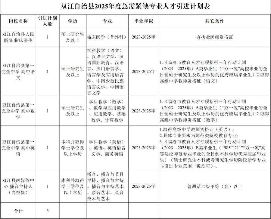 根據《臨滄市人才招引三年行動計劃(2023-2025年)》《臨滄市人力資源和社會保障局關于進一步做好事業(yè)單位急需緊缺人才引進工作的通知》(臨人社發(fā)〔2024〕139號)和《中共雙江縣人才工作領導小組關于進一步做好事業(yè)單位急需緊缺專業(yè)人才引進工作的通知》(雙黨人才〔2025〕3號)精神,我縣2025年計劃公開引進急需緊缺專業(yè)人才5人,現將有關事項公告如下: