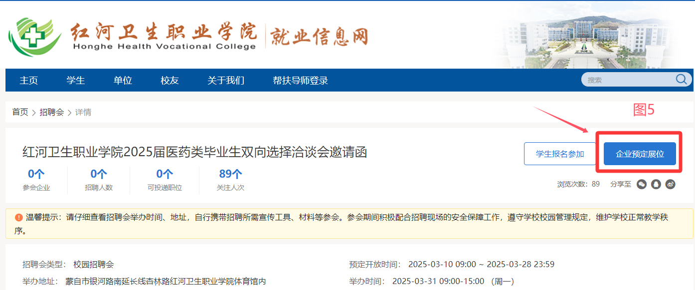 (二)預(yù)定展位:點(diǎn)擊“紅河衛(wèi)生職業(yè)學(xué)院2025屆醫(yī)藥類畢業(yè)生大型雙向選擇洽談會”端口進(jìn)入“企業(yè)預(yù)定展位”(操作流程如圖4、圖5所示)。