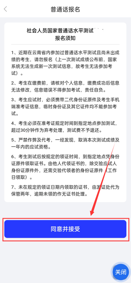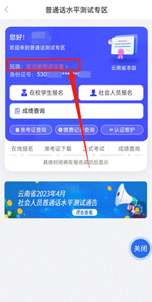 完成實(shí)名認(rèn)證后,在APP首頁找到“普通話測(cè)試報(bào)名”,點(diǎn)擊進(jìn)入普通話水平測(cè)試專區(qū)界面,選擇“云南省普通話培訓(xùn)測(cè)試中心”后,點(diǎn)擊“進(jìn)入首頁”。