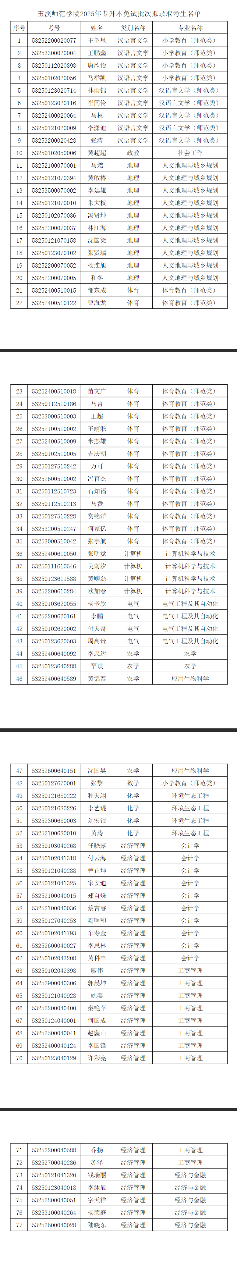 根據(jù)《云南省教育廳關(guān)于印發(fā)2025年普通高等學(xué)校專升本統(tǒng)一考試和免試招生工作辦法的通知》相關(guān)規(guī)定,我校于2025年4月11日完成了專升本免試生綜合考查工作,將考查結(jié)果進(jìn)行了公示并上報(bào)云南省招生考試院。經(jīng)云南省招生考試院對專升本免試批次平行志愿投檔,現(xiàn)將我校2025年專升本免試批次擬錄取考生名單公示如下,公示期為2025年4月27日至4月30日,公示期內(nèi)如有異議,請向玉溪師范學(xué)院招生辦公室或玉溪師范學(xué)院紀(jì)檢處反映。