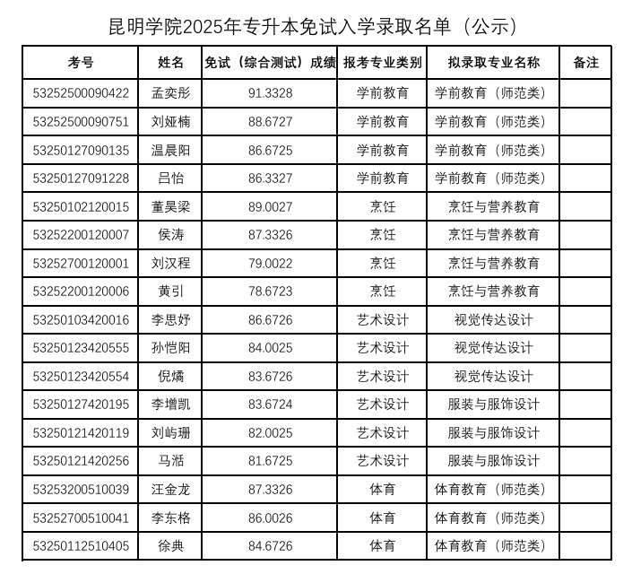 昆明學院2025年專升本免試入學錄取名單(公示)