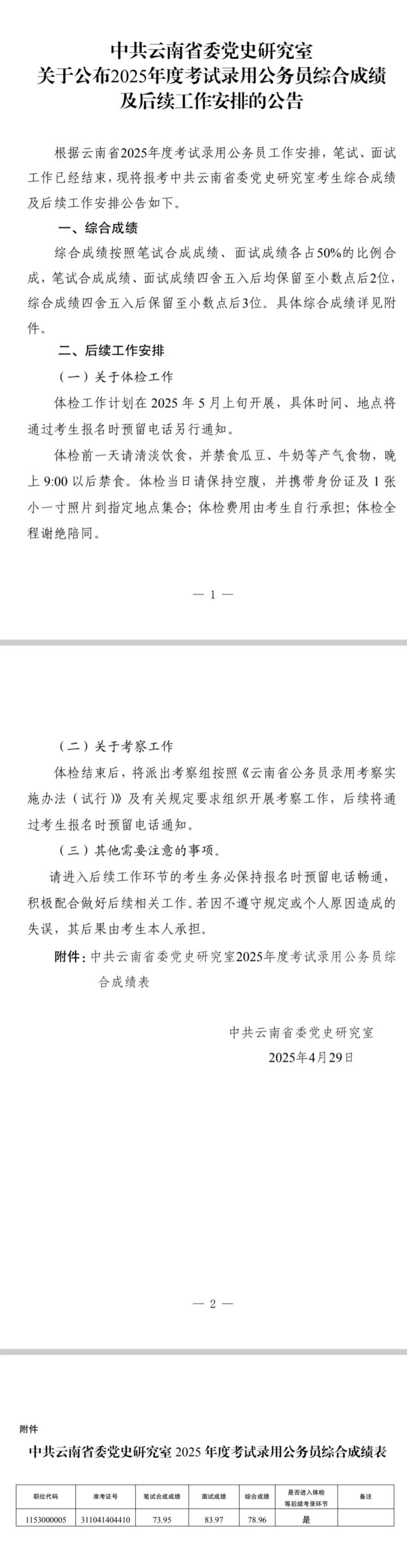 中共云南省委黨史研究室 關于公布2025年度考試錄用公務員綜合成績及后續(xù)工作安排的公告