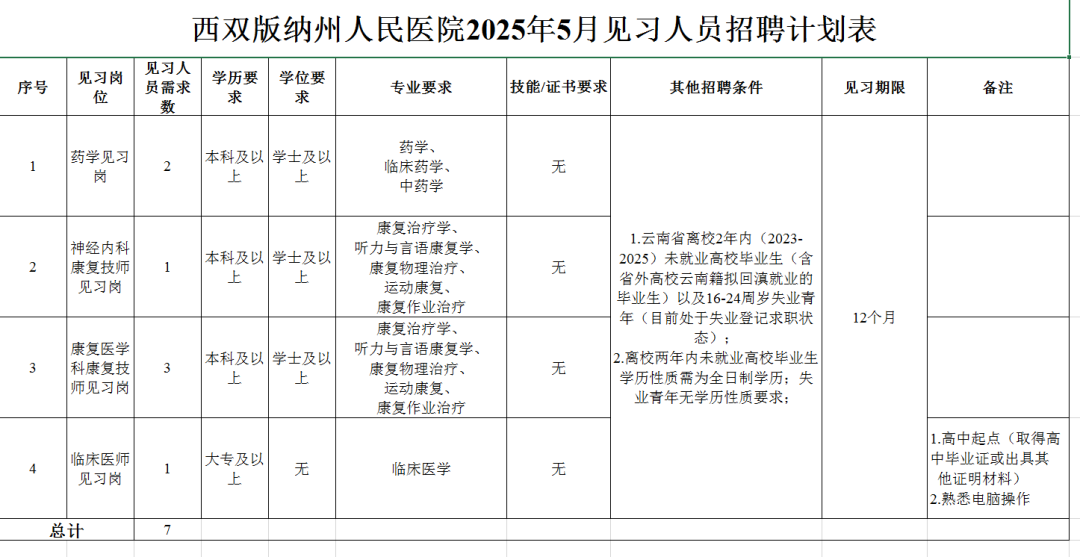 詳見《西雙版納州人民醫(yī)院2025年5月見習(xí)人員招聘計(jì)劃表》(附件1)。