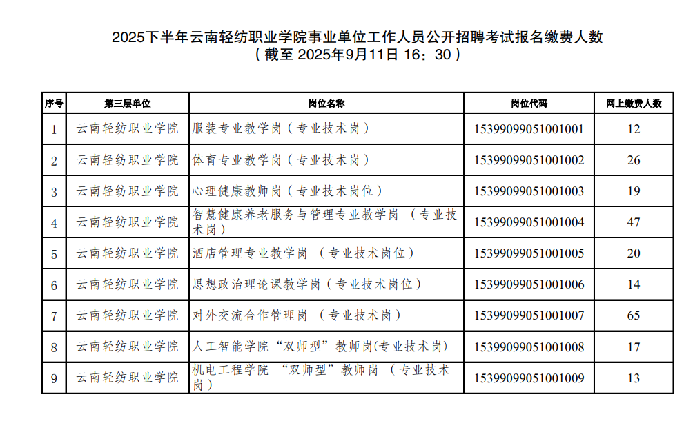 2025年下半年云南輕紡職業(yè)學(xué)院公開招聘人員報名情況統(tǒng)計