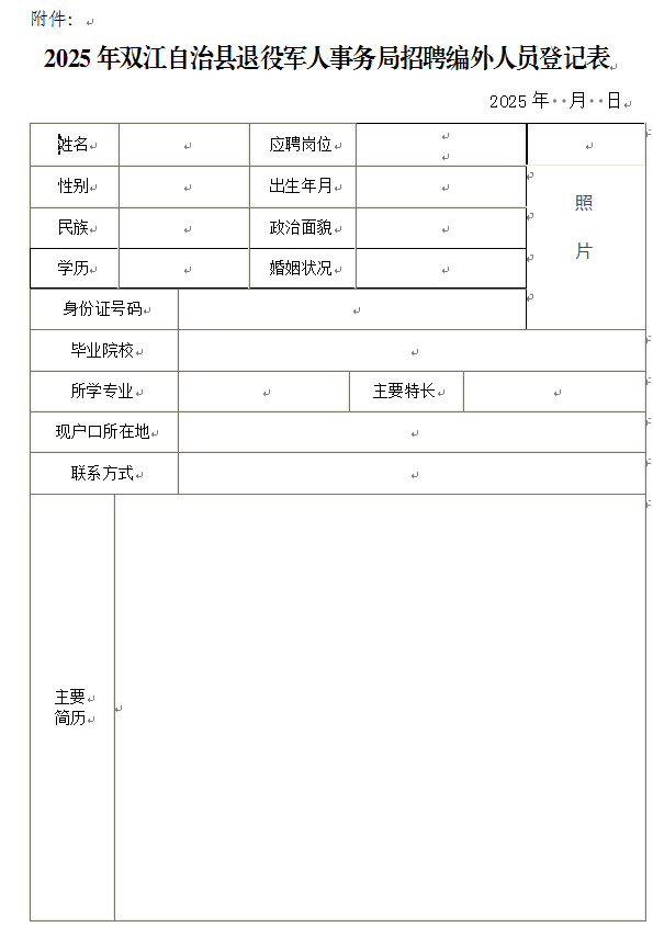 3.報名時需提供本人戶口冊、身份證原件及復印件,近期免冠一寸彩色證件照1張及照片電子版,學歷證書原件及復印件,《2025年雙江自治縣退役軍人事務(wù)局招聘編外人員登記表》。填報虛假信息或提供虛假材料的,一經(jīng)查實,取消報名資格及后續(xù)環(huán)節(jié),被招聘的取消聘用。