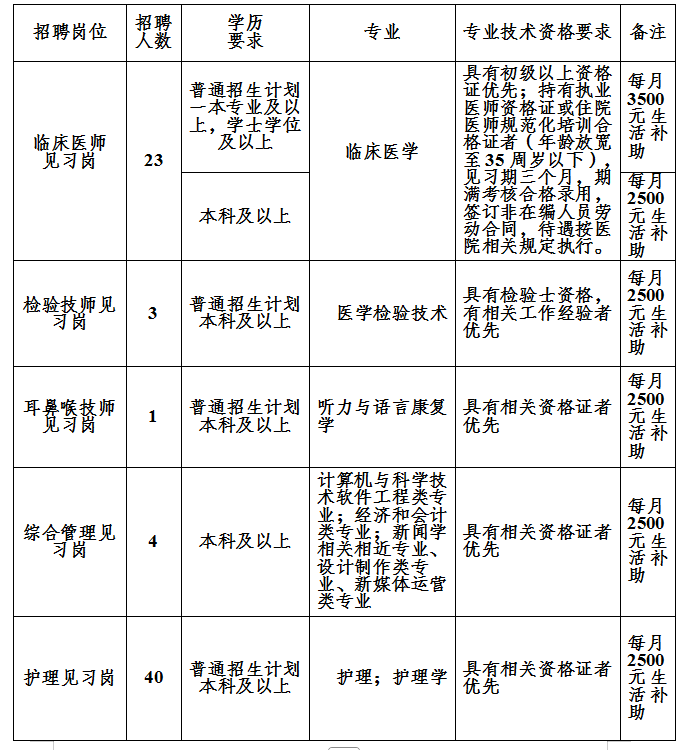 (二)見習(xí)期間給予相應(yīng)生活補(bǔ)助費(fèi),臨床醫(yī)師見習(xí)崗(一本)每人每月不低于3500元;臨床醫(yī)師見習(xí)崗(本科)、醫(yī)技和管理類見習(xí)崗、護(hù)理見習(xí)崗每人每月不低于2500元。