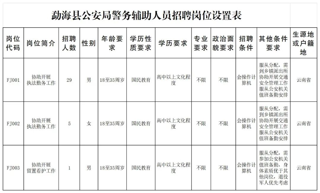 本次共招聘輔警35人,主要在勐??h公安局協(xié)助開展執(zhí)法勤務(wù)工作等工作。輔警不具有人民警察和公務(wù)員身份,不行使人民警察職權(quán)。具體崗位見《勐??h公安局警務(wù)輔助人員招聘崗位設(shè)置表》