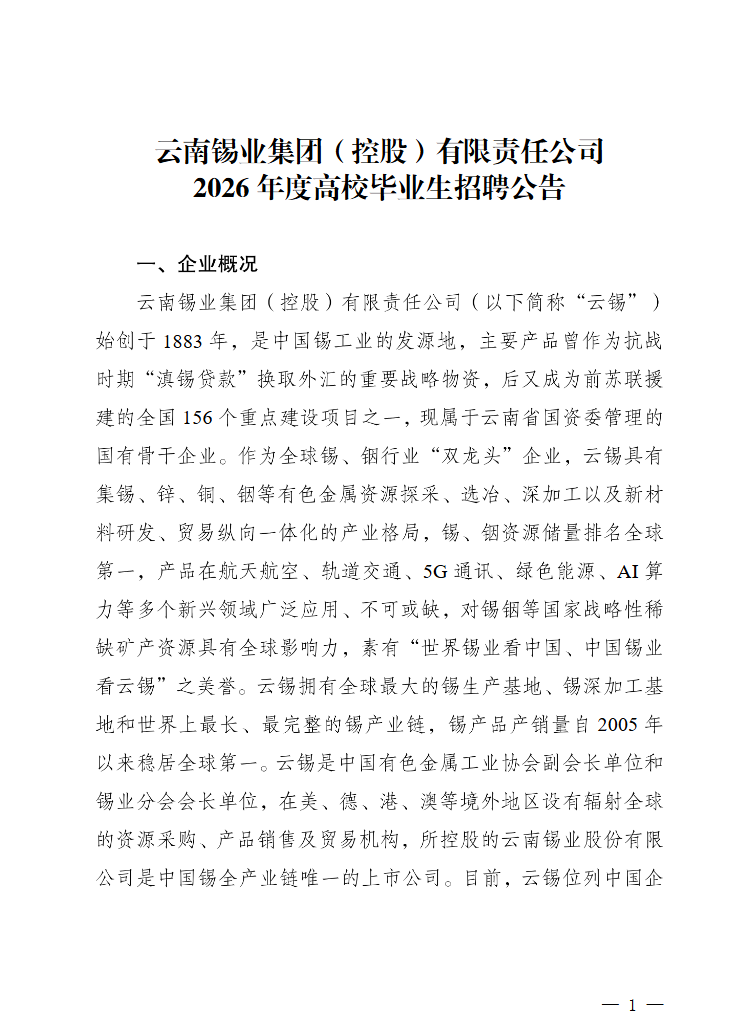 附件【附件:云南錫業(yè)集團(tuán)(控股)有限責(zé)任公司2026年高校畢業(yè)生招聘計(jì)劃崗位明細(xì)表.pdf】