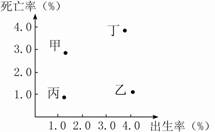 21.圖4表示甲、乙、丙、丁四個國家的人口出生率與死亡率。其中反映人口高出生率、低死亡率、高自然增長率特點(diǎn)的國家是