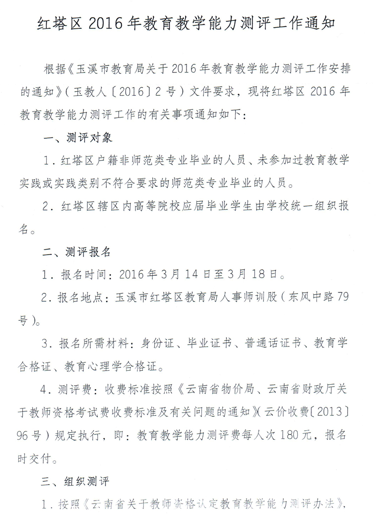 紅塔區(qū)2016年教育教學(xué)能力測評工作通知
