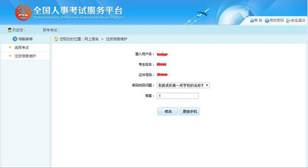 通過點擊系統(tǒng)導航菜單中“注冊信息維護”選項,可跳轉到修改注冊信息頁面,其中 登入用戶名、考生姓名和證件號碼等考生關鍵信息不允許進行修改,如下圖所示: