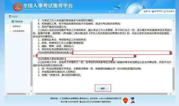 點擊“接受”按鈕,進入查看考生承諾書的頁面,如下圖所示: