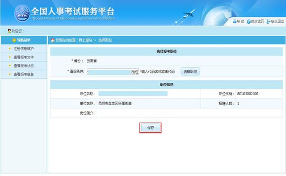 選擇相應的職位,點擊“保存”按鈕,提示保存成功,跳轉到報考流程頁面,如下圖所示: