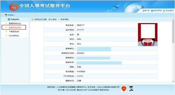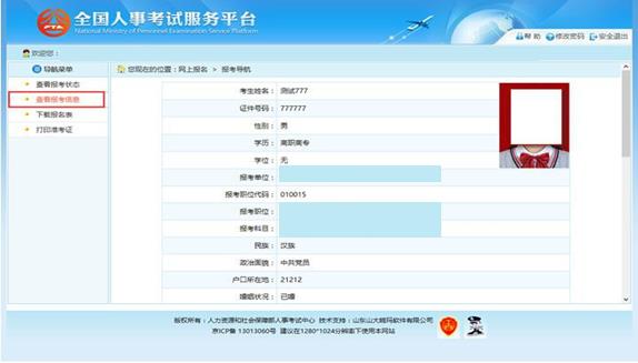 點擊系統(tǒng)導航菜單的“查看報考信息”選項,可進入查看考生報考信息的頁面,如下 圖所示: