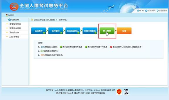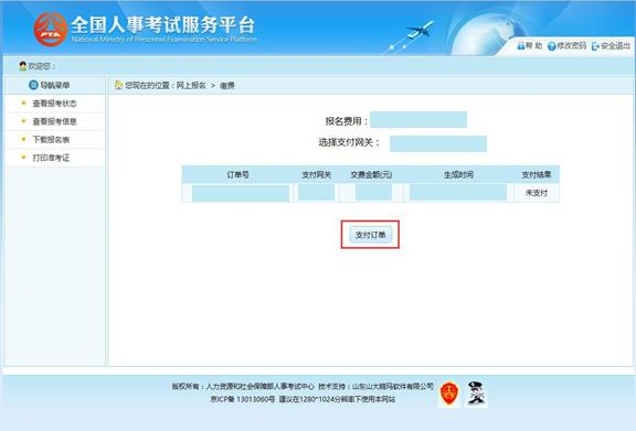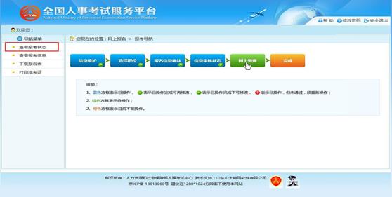 通過審核的考生可以進行網上繳費,點擊報考流程中“網上繳費”選項,可以進入網 上繳費的頁面,如下圖所示: