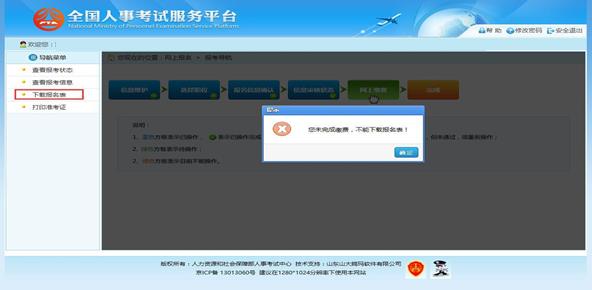 點擊系統(tǒng)導航菜單的“下載報名表”選項,可以下載考生信息表;下載考生信息表操 作必須在考生完成繳費之后才能進行,如果考生未完成繳費點擊“下載報名表”菜單,系 統(tǒng)會提示“您未完成繳費,不能下載報名表”。如下圖所示: