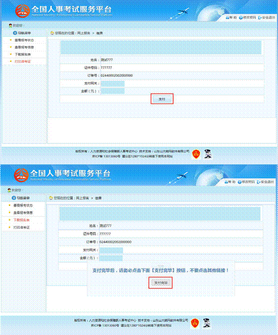 訂單確認無誤后,點擊“支付”按鈕,成功后再點擊“支付完畢”按鈕完成網上支付 操作,如下圖所示: