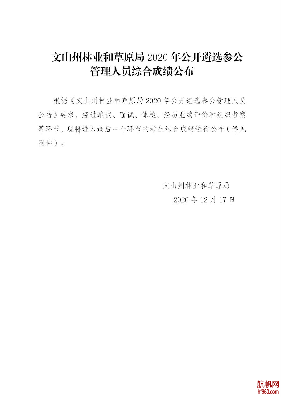 文山州林業(yè)和草原局2020年公開遴選參公管理人員綜合成績公布