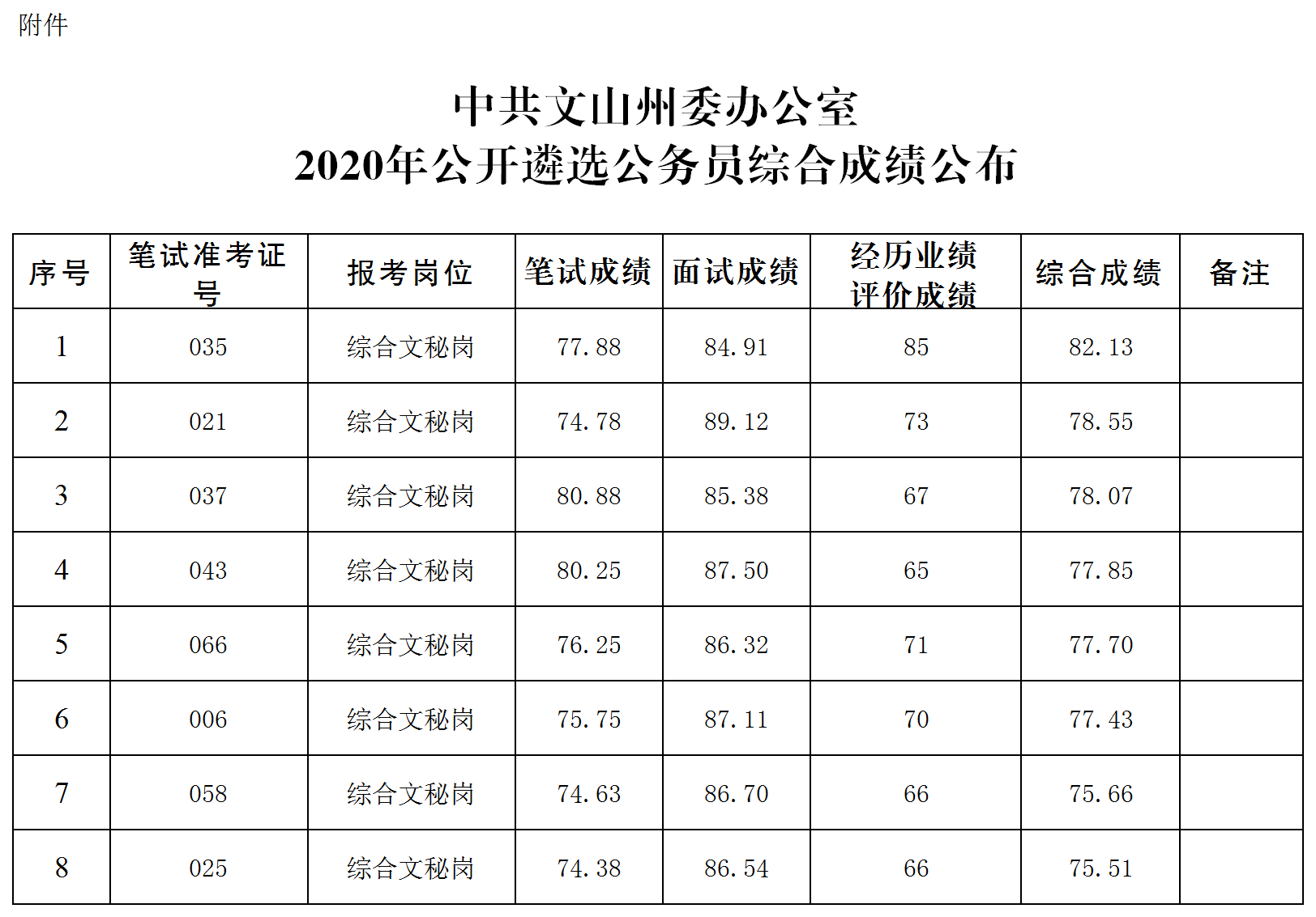 中共文山州委辦公室2020年公開遴選公務員綜合成績公布