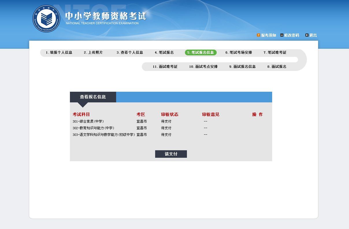 (1)考生報名經(jīng)現(xiàn)場審核通過后,再次登陸網(wǎng)上報名系統(tǒng),點擊[報名信息],會看到“請支付”按鈕(圖1)