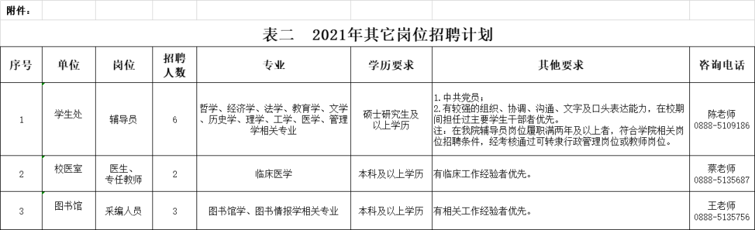 2021年計(jì)劃招聘專任教師103人,輔導(dǎo)員6人,校醫(yī)室醫(yī)生2人,圖書館采編人員3人。詳見招聘計(jì)劃。