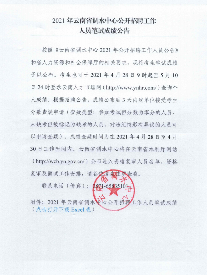 云南省調(diào)水中心2021年公開招聘工作人員筆試成績