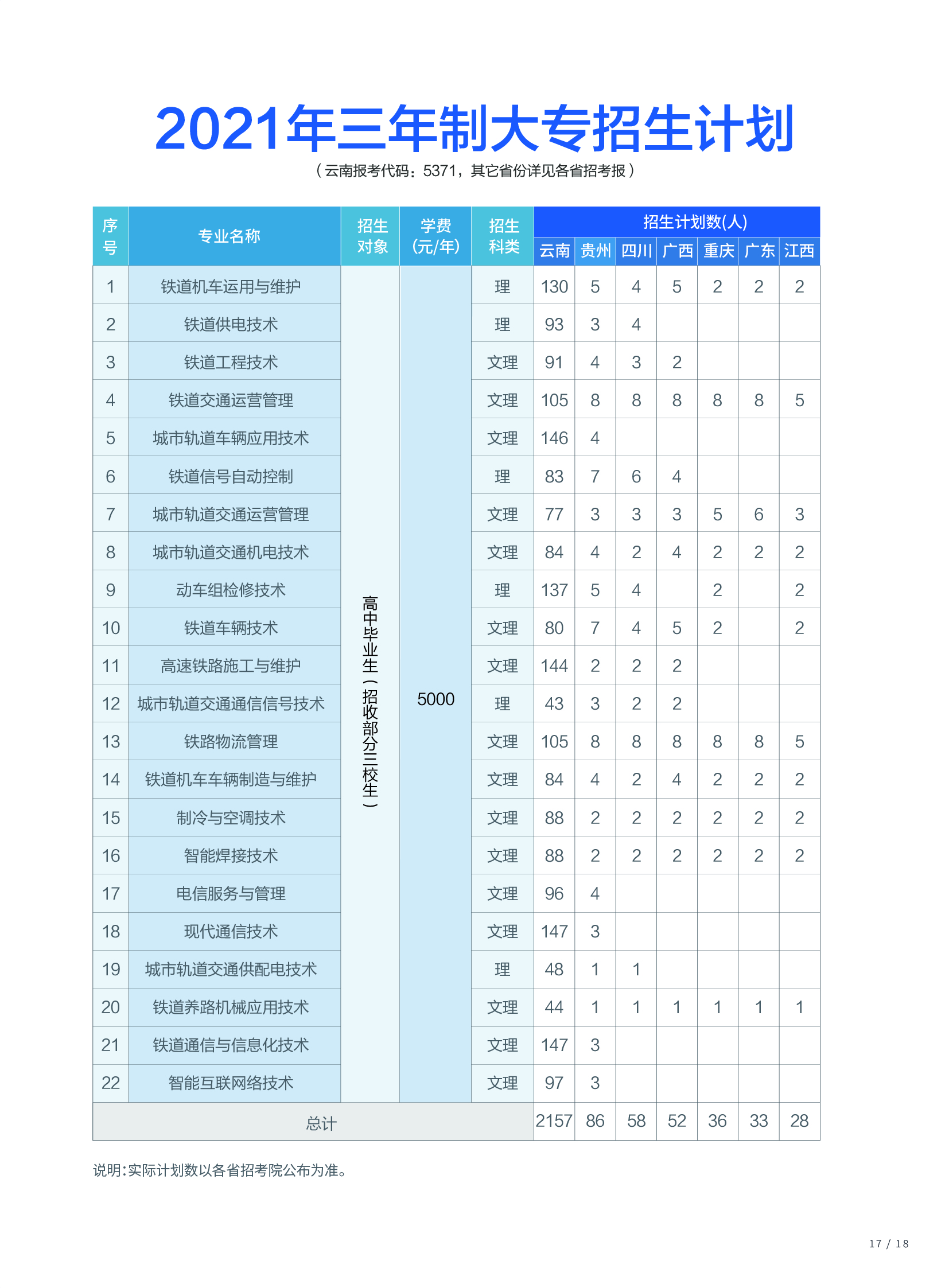 昆明鐵道職業(yè)技術(shù)學(xué)院2020年招生計劃