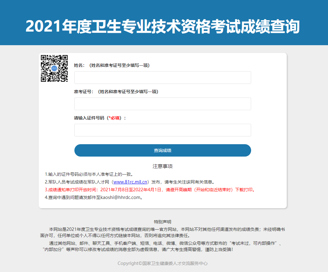 2021年度衛(wèi)生專業(yè)技術資格考試成績查詢公告