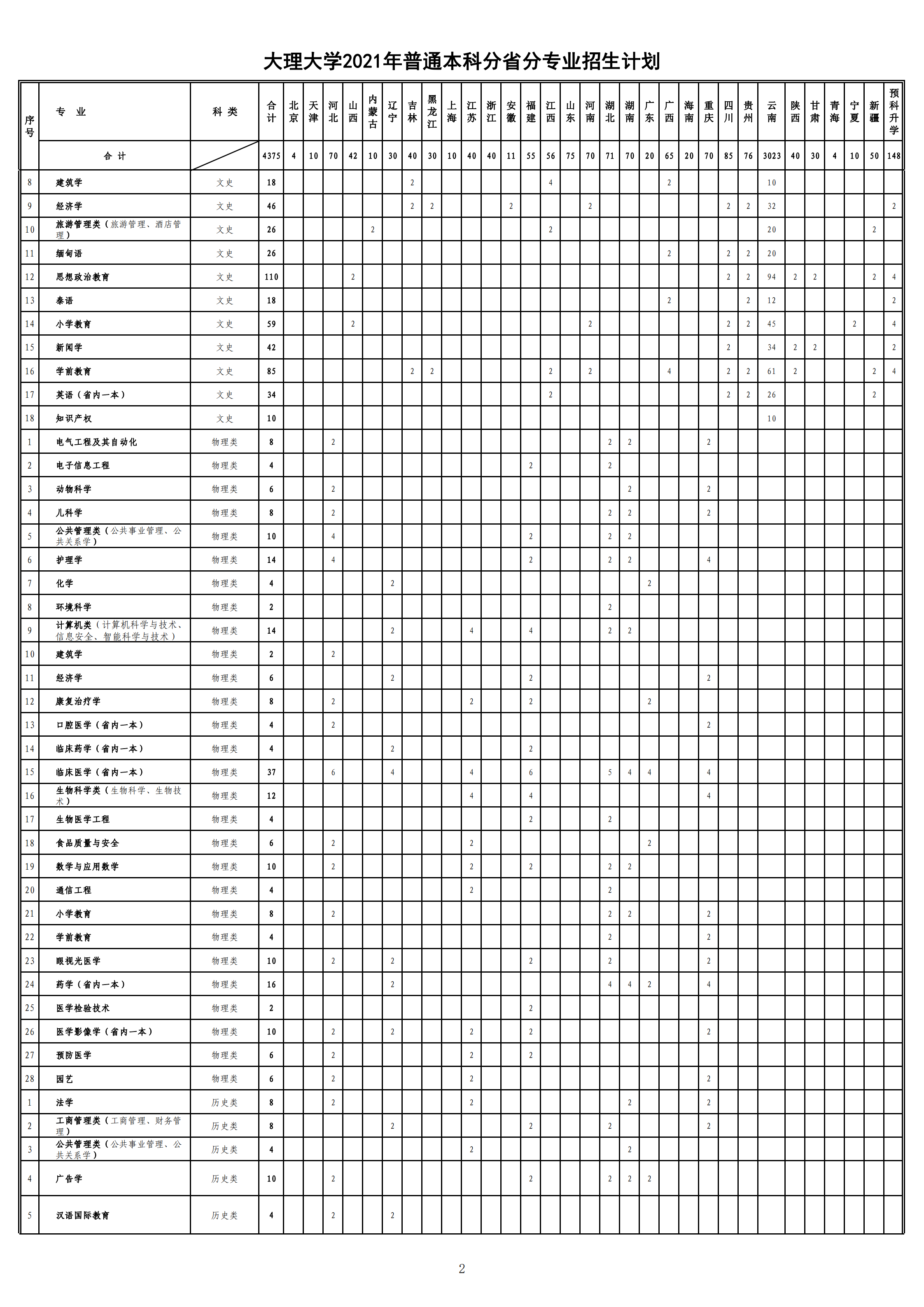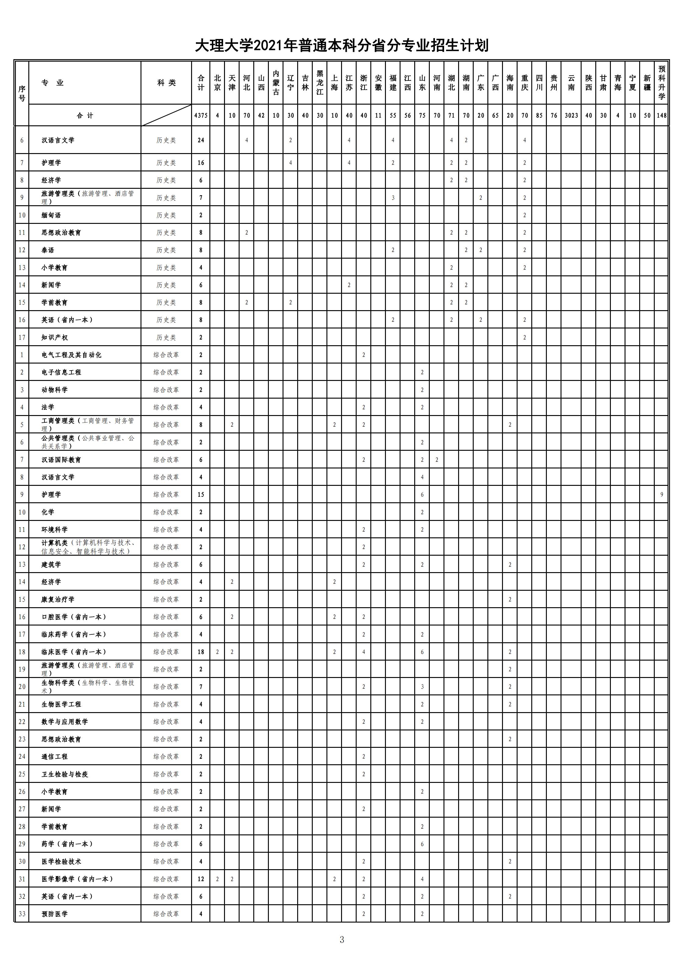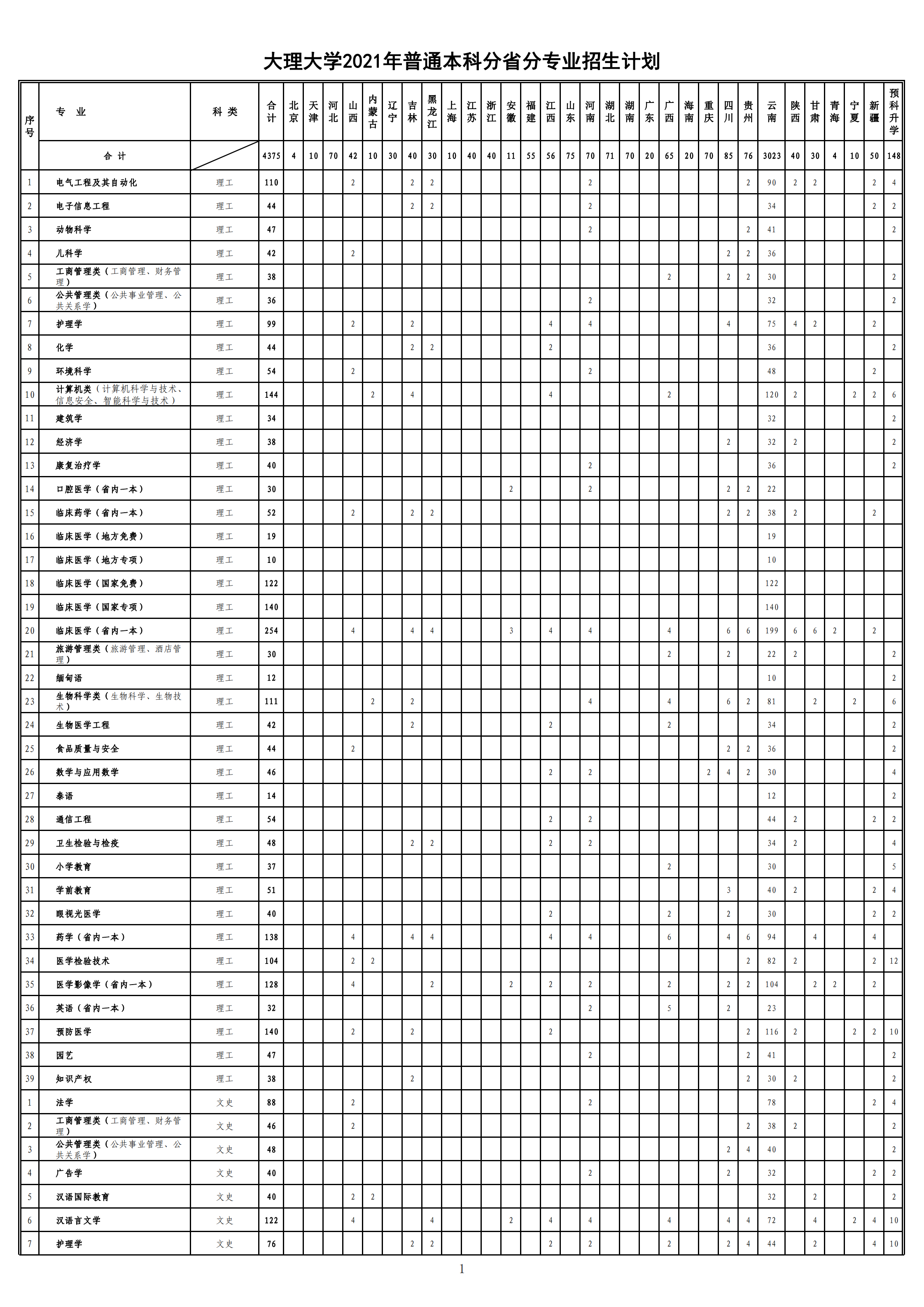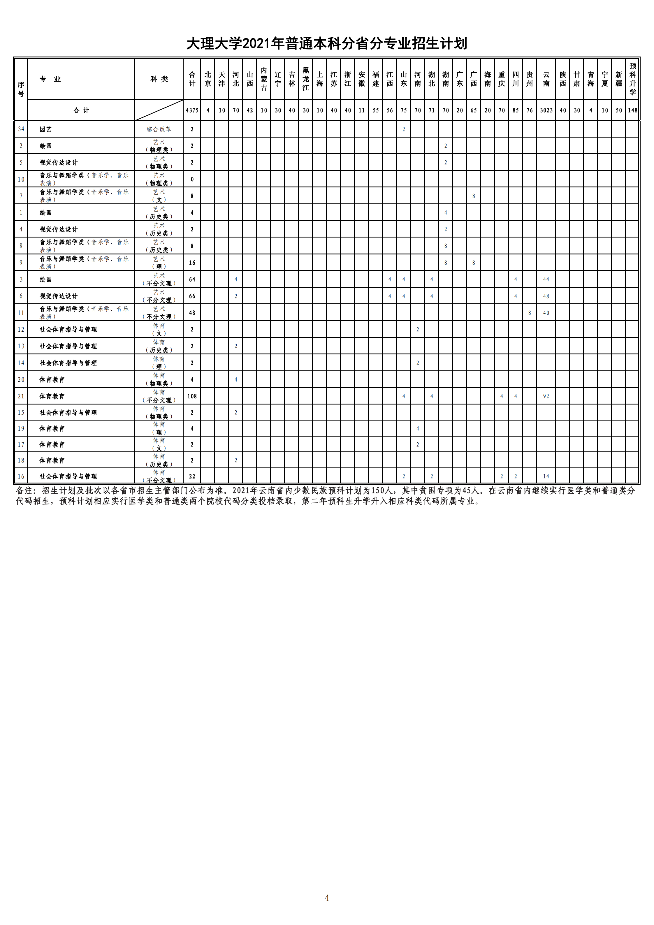 大理大學(xué)2021年普通本科分省分專業(yè)招生計劃