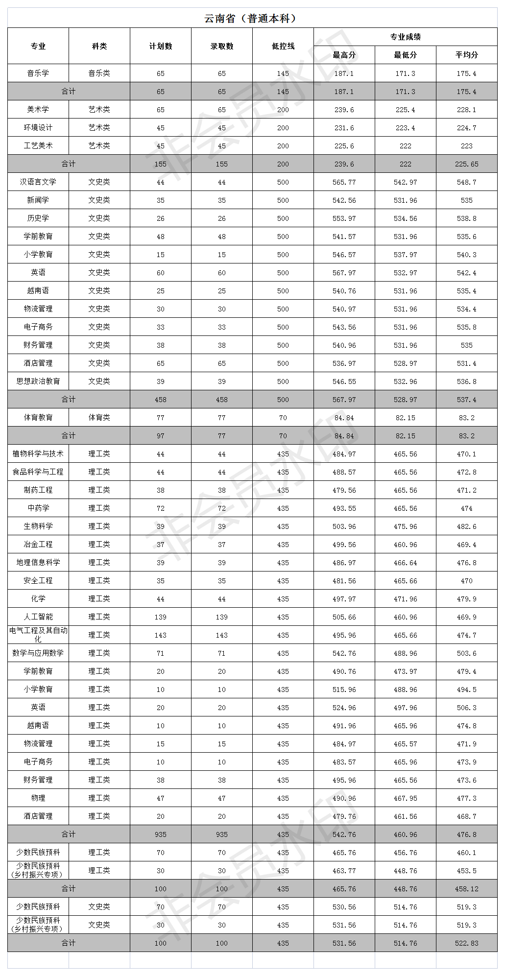 文山學(xué)院2021年招生錄取分?jǐn)?shù)統(tǒng)計四(云南二批本科)