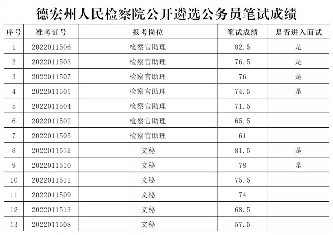 根據(jù)《德宏州人民檢察院2021年公開遴選公務員公告》,現(xiàn)將筆試成績及面試人員公布如下: