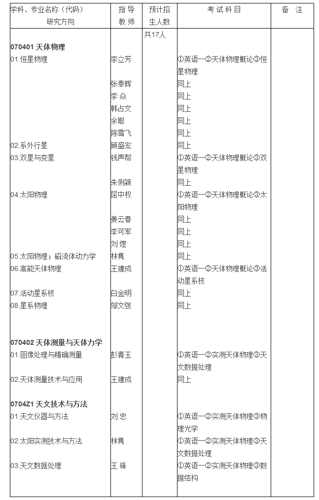 云南天文臺自1982年開始招收研究生,是天文學一級學科單位,設有天體物理、天體測量與天體力學、天文技術與方法3個學術型學位的碩士點與博士點,光學工程1個專業(yè)型學位的碩士點,1個天文學博士后流動站,1個院級重點實驗室。現(xiàn)有職工240人,其中研究生導師46人;在讀研究生119人,在站博士后6人。云南天文臺各團組與英國、美國、德國、法國等眾多國家的著名天文研究機構有著廣泛的交流,并與國內其它科研院所、美國哈佛-史密松研究所聯(lián)合培養(yǎng)研究生。