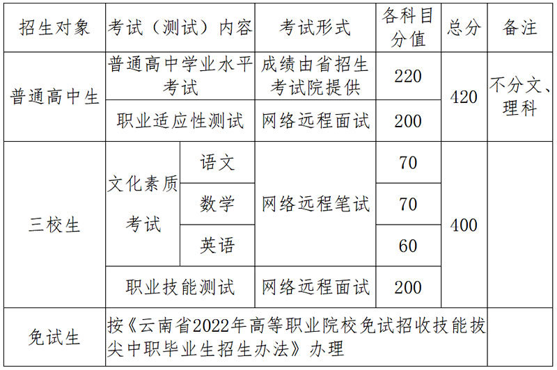 根據(jù)《云南省2022年高職院校單獨(dú)考試招生辦法》《云南省2022年高等職業(yè)院校免試招收技能拔尖中職畢業(yè)生招生辦法》的文件精神,為了組織好我校2022年單獨(dú)考試招生工作,特制定本方案。