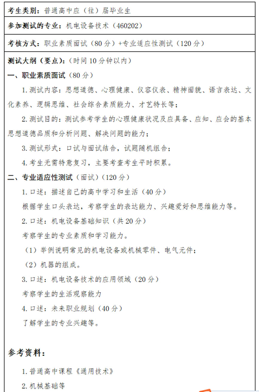 為貫徹落實(shí)《國務(wù)院關(guān)于深化考試招生制度改革的實(shí)施意見》(國發(fā)〔2014〕35號),加快推進(jìn)高職(高專)院校分類考試,深化高職院校單獨(dú)招生改革,選拔綜合素質(zhì)高,創(chuàng)新、實(shí)踐能力強(qiáng)的優(yōu)秀學(xué)生,更好地培養(yǎng)適應(yīng)經(jīng)濟(jì)社會發(fā)展的高技能人才,并為確保我校單獨(dú)招生工作公平、公正、公開、按質(zhì)、按量、按時(shí)完成,特制定本考試大綱。