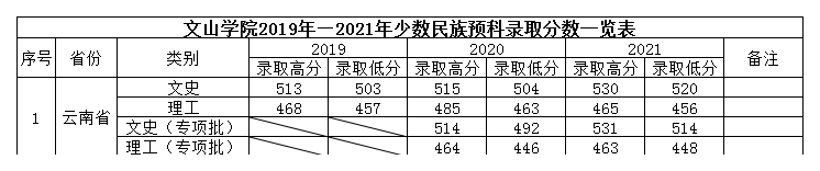 2019年—2021年文山學(xué)院少數(shù)民族預(yù)科錄取分?jǐn)?shù)一覽表