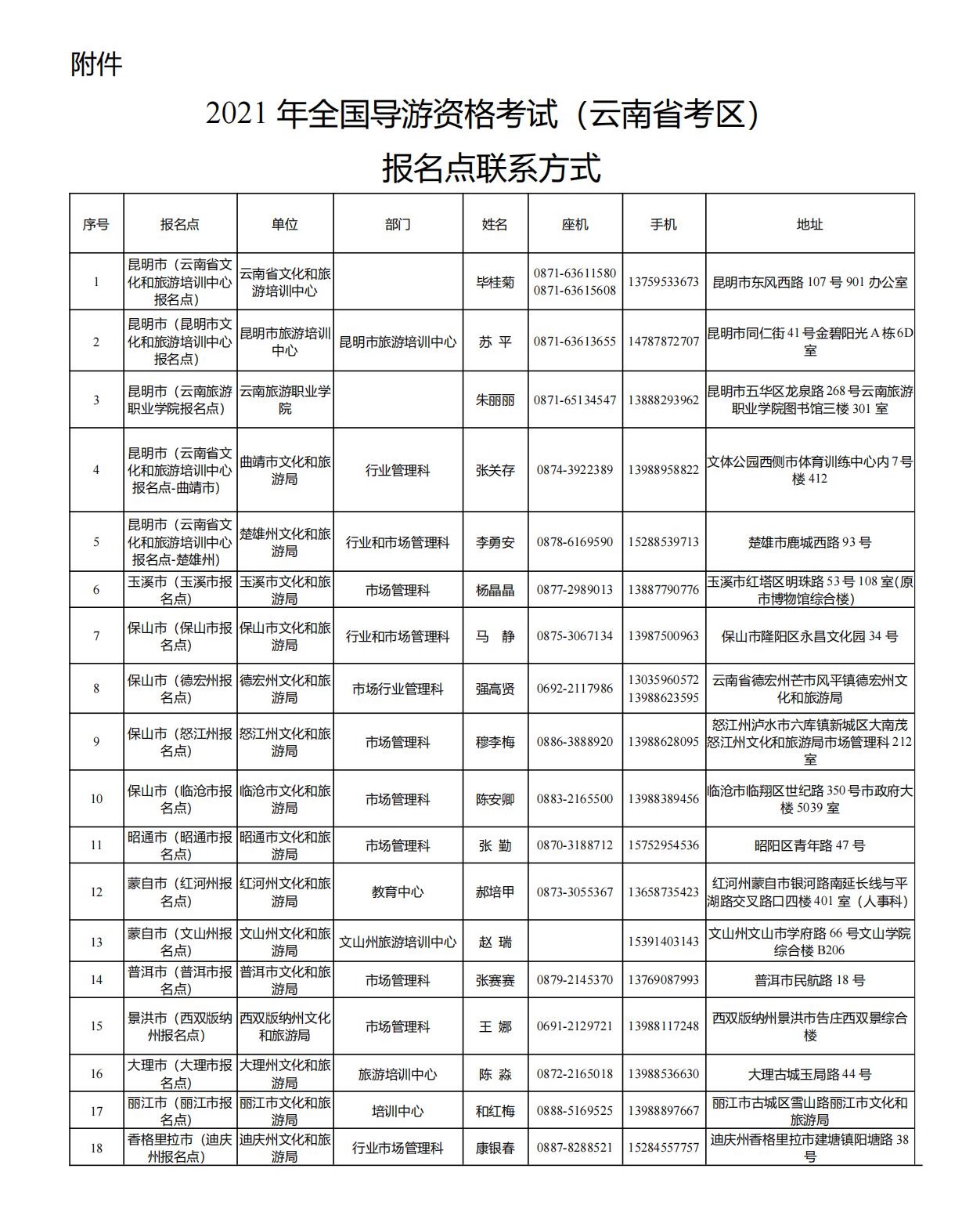 附件:2021年全國導游資格考試(云南考區(qū))報名點聯(lián)系方式