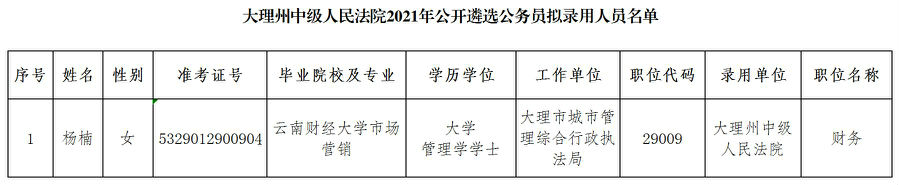 大理州中級人民法院2021年公開遴選公務(wù)員擬錄用人員公示