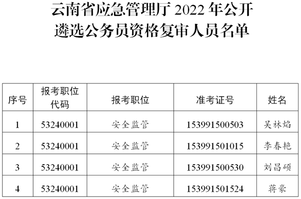 附件:云南省應(yīng)急管理廳2022年公開遴選公務(wù)員資格復(fù)審人員名單