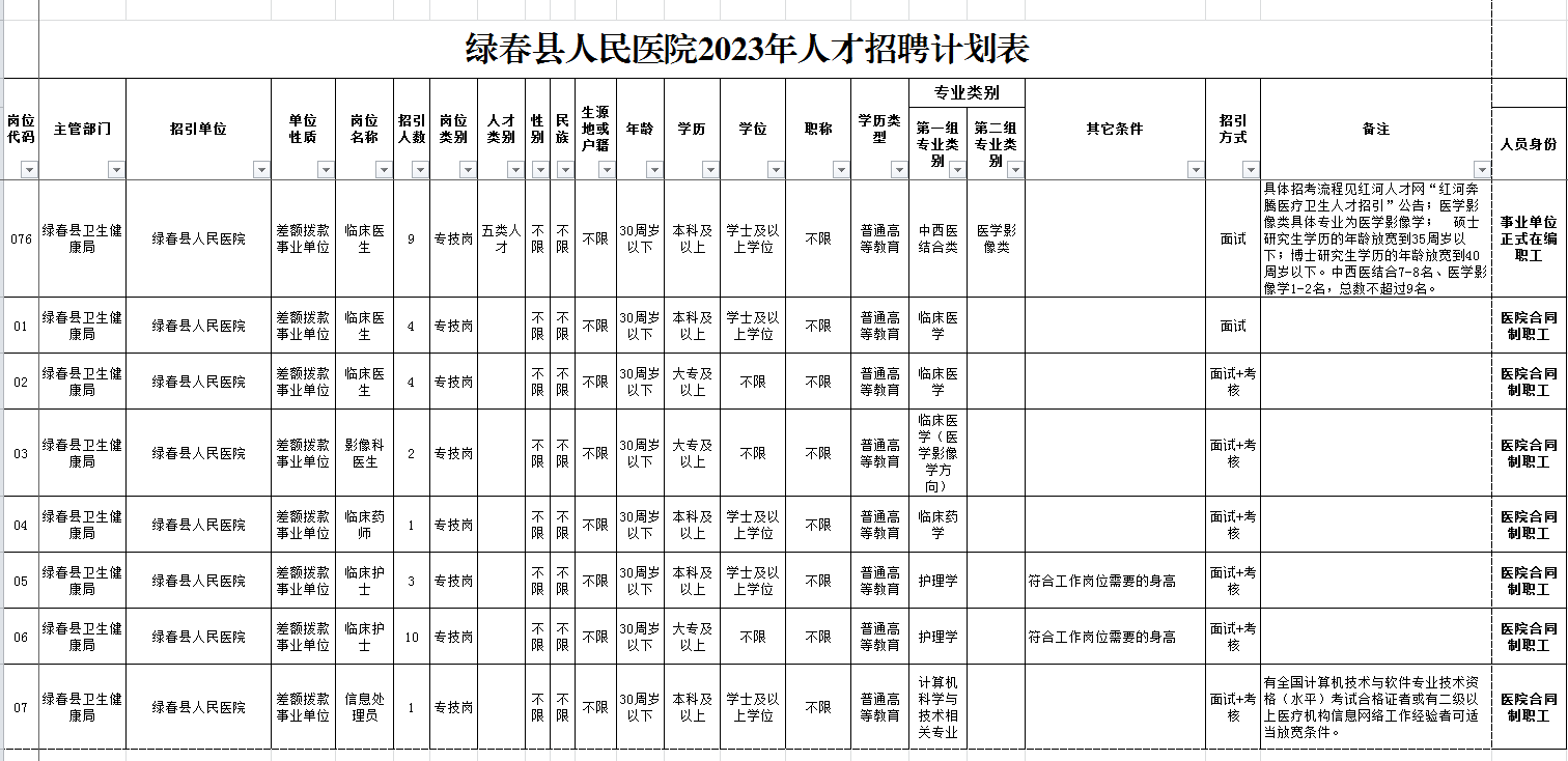 2.醫(yī)院合同制職工25名,具體見附件《綠春縣人民醫(yī)院2023年人才招聘計(jì)劃表》,報(bào)名截止時(shí)間為2023年2 月20日。人員招滿為止,具體面試(考核),結(jié)合現(xiàn)場招聘情況及醫(yī)院安排決定。專科學(xué)歷需要面試、筆試。