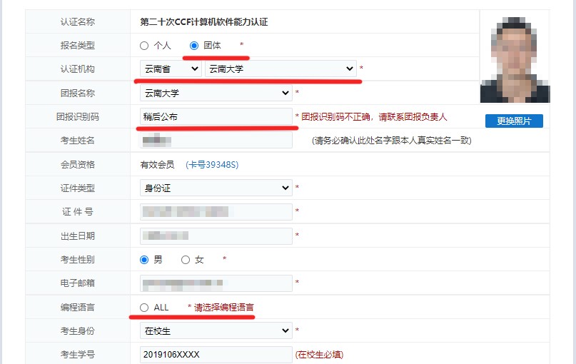 (2)報名。點擊“認證報名”,進入報名頁面,參見下圖。報名類型選擇“團體”,認證機構選擇“云南大學”,團報名稱選擇“云南大學”,填寫團體報名識別碼,該識別碼之后會單獨通知,享受團體報名優(yōu)惠資格。根據個人情況,填寫其他信息,上傳個人證件照片。