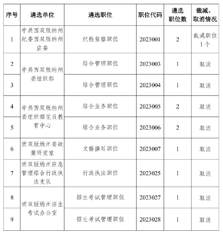 2023年西雙版納州級(jí)機(jī)關(guān)統(tǒng)一公開(kāi)遴選公務(wù)員報(bào)名已于2023年3月26日18時(shí)結(jié)束。根據(jù)《2023年西雙版納州級(jí)機(jī)關(guān)統(tǒng)一公開(kāi)遴選公務(wù)員公告》筆試開(kāi)考比例規(guī)定,現(xiàn)將裁減、取消職位情況予以通告: