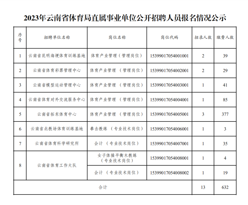 2023年云南省體育局直屬事業(yè)單位招聘最終報(bào)名數(shù)據(jù)